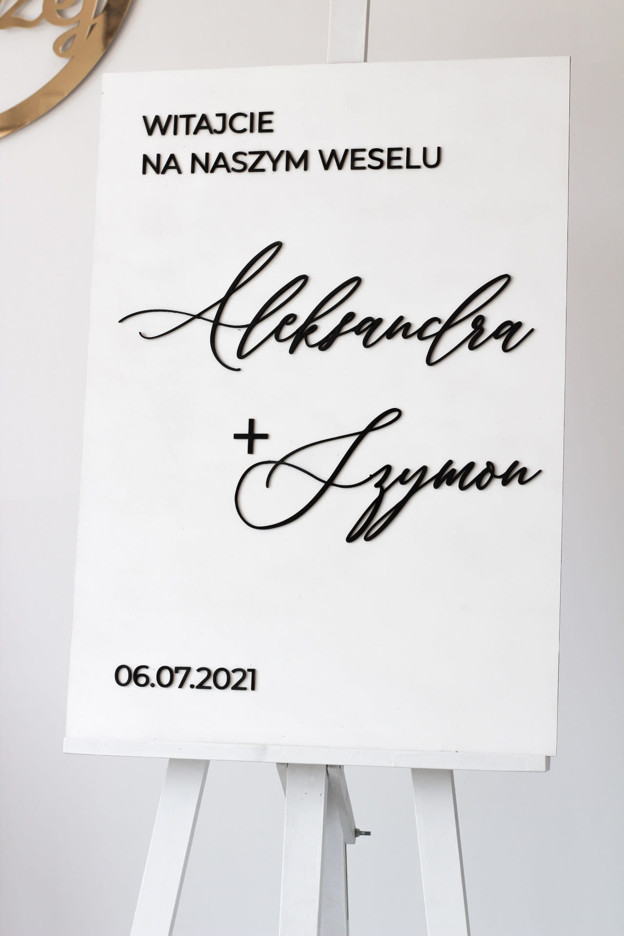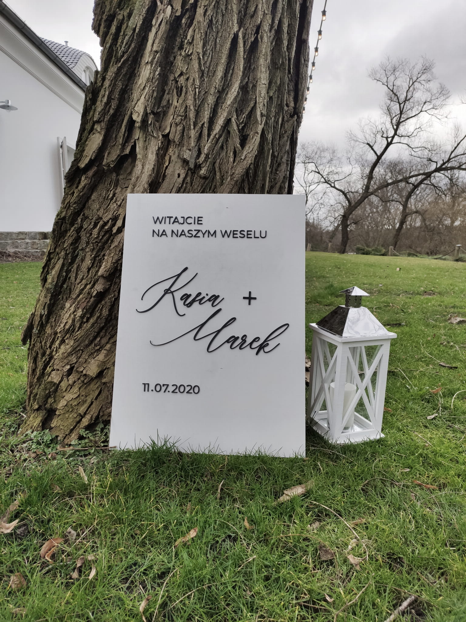 Biała, drewniana tablica powitalna z imionami