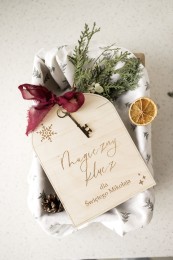 Magiczny klucz dla Świętego Mikołaja, dzięki któremu będzie mógł wejść z prezentami nie tylko przez komin :) Klucz dołączony jest do drewnianej kartki na pięknej, szyfonowej wstążce.
