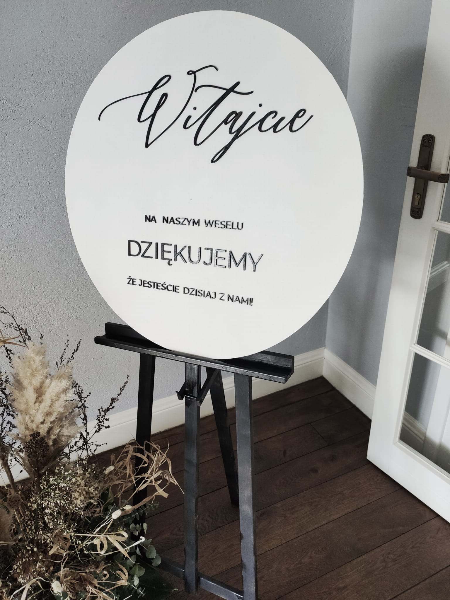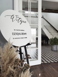 Okrągła, biała tablica powitalna