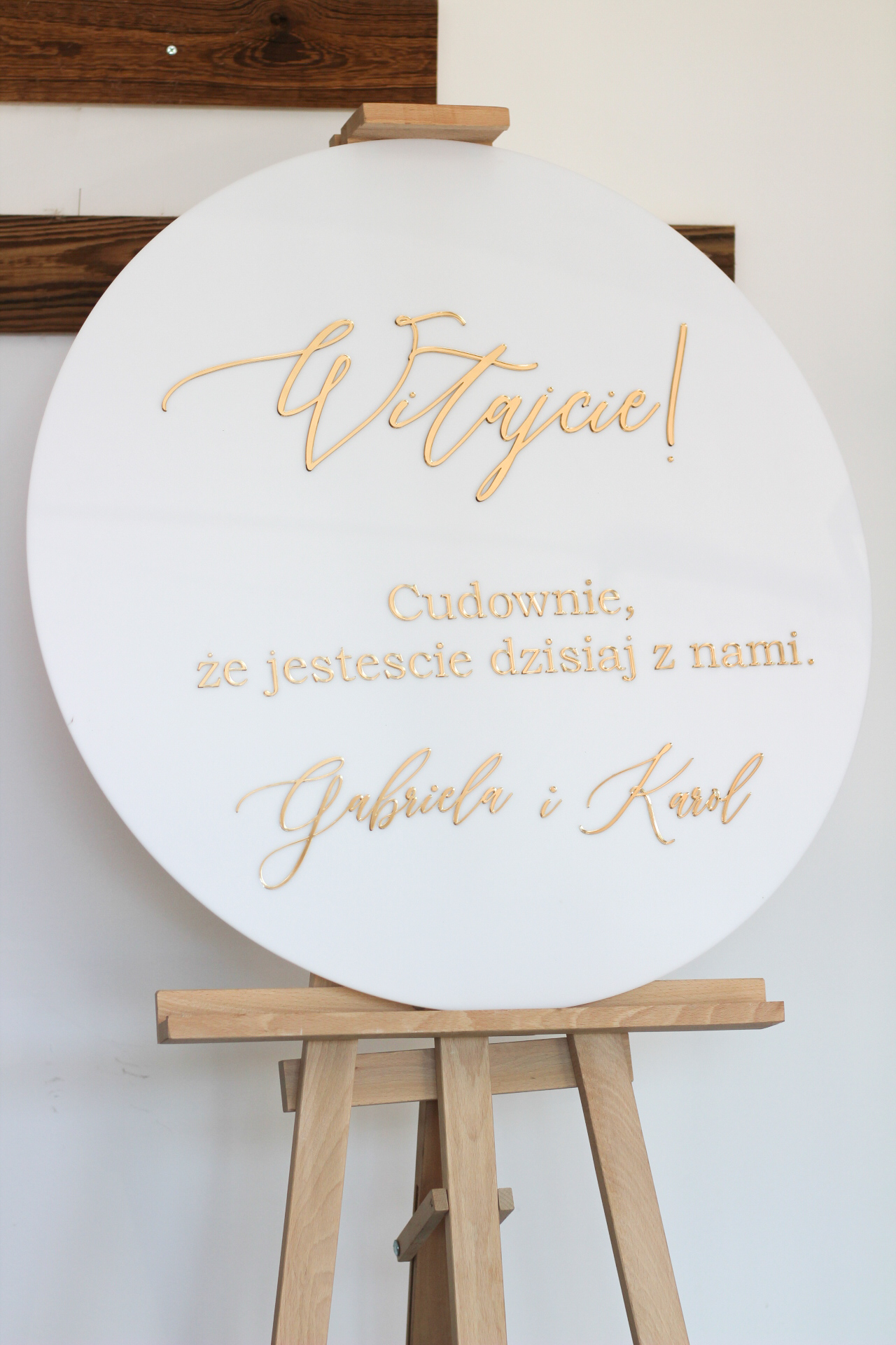 - elegancka tablica wykonana z mlecznej pleksi ze złotymi, lustrzanymi napisami