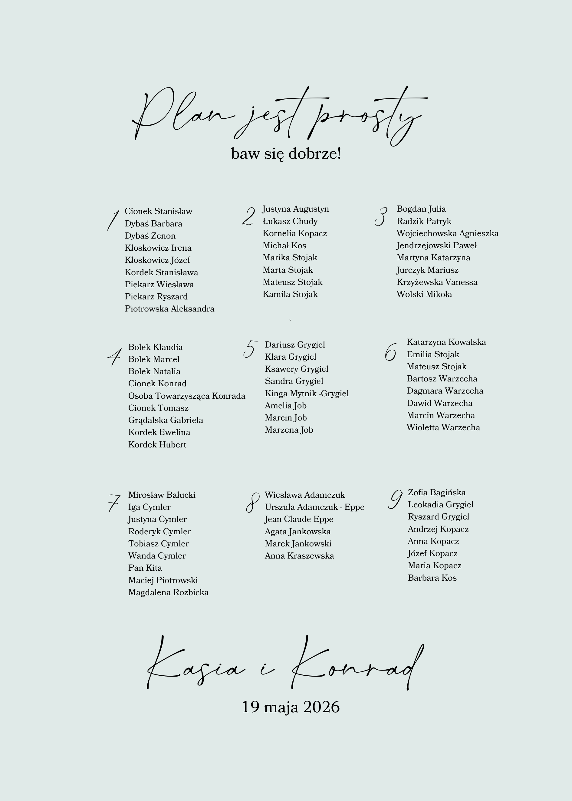 - Pliki z rozmieszczeniem gości prosimy przesyłać w wordzie lub pdf, bez żadnego formatowania, tabeli i numeracji typu 1. xxx, 2. xxx jeżeli nie ma się ona znaleźć na produkcie. Najwygodniej będzie, jeśli po prostu wkleicie ją w treść maila.