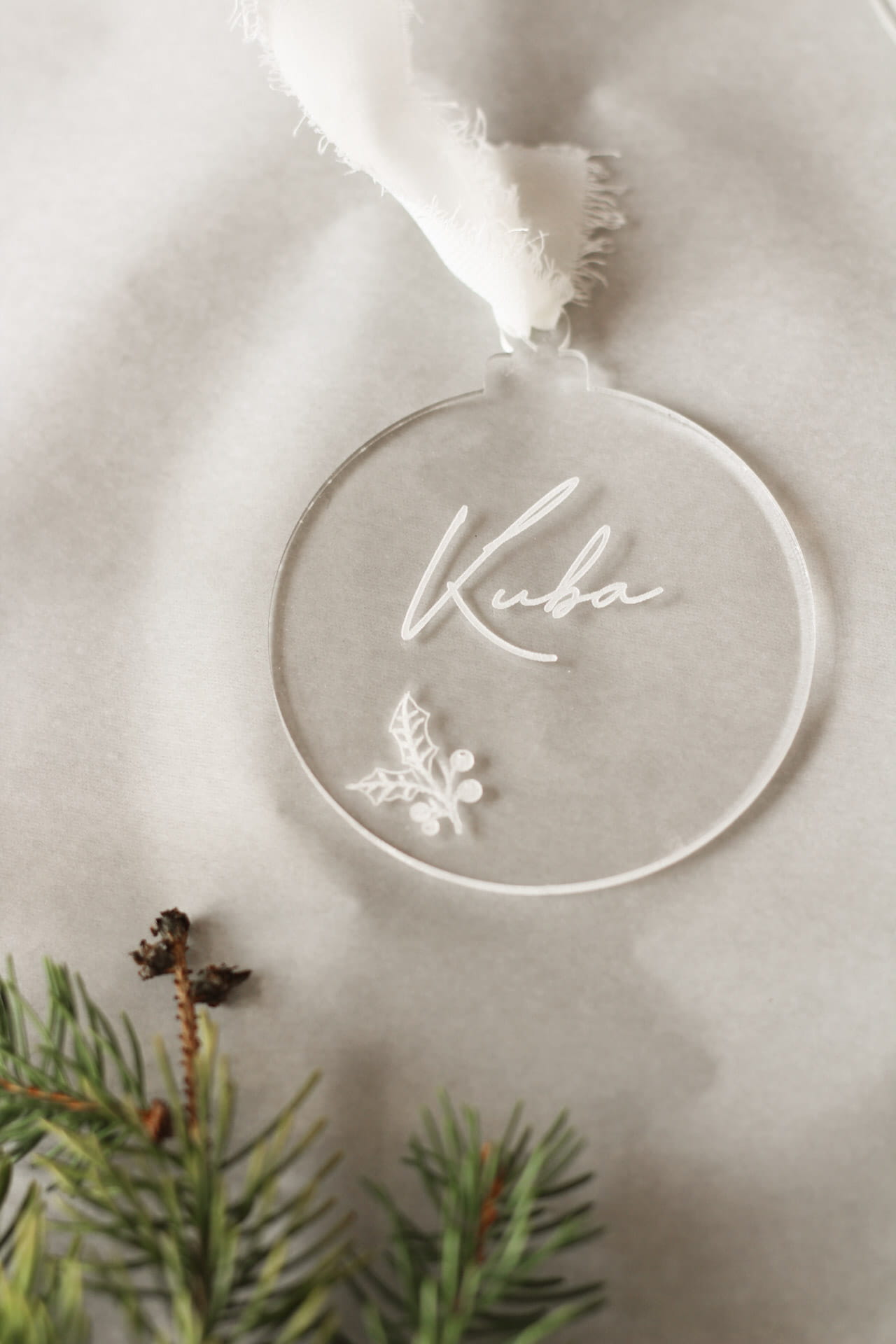 Transparentna bombka z imieniem i motywem świątecznej jemioły :)